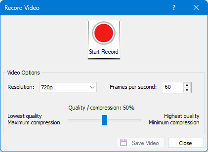 In the Record Video dialog, adjust settings for Resolution, Frames per second, and Quality / Compression. These settings apply when the video is saved.