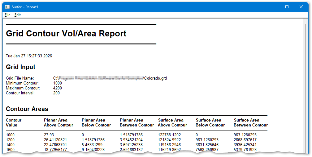 | Grid Contour Vol/Area Report window. |