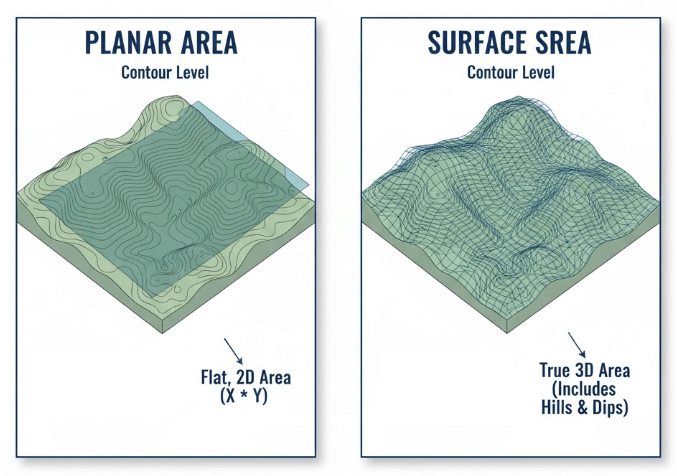 Surface Area: Includes the 3D "hills and dips" of the terrain. The Surface Area will always be larger than or equal to the Planar Area.