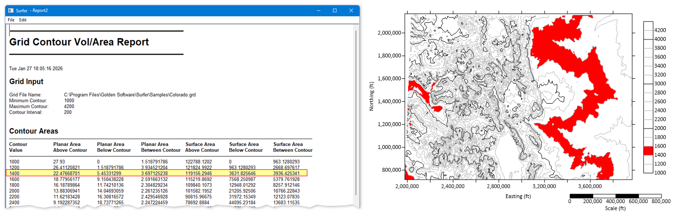 The report provides two types of area measurements, planar and surface which it reports as above, below or between various contour lines.