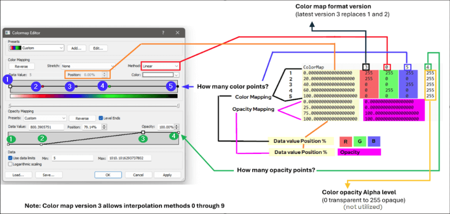 The image below provides a detailed breakdown of the .CLR file format (version 3) and its relationship to the Colormap Editor dialog. It visually connects the settings and controls used in the software interface—including color and opacity anchor nodes—to their corresponding data values within the .CLR file itself.